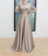 Our Jameelah Beige Satin made with premium quality Satin is perfect for family functions, evening outings special dinners and wedding guest dress. it features a ruched waistband and cuff, round neckline and fit and flare silhouette.